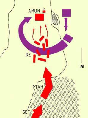 하지만 고고학적 발견에 의하면 위의 사진처럼 일렬로 오는 이집트군을 히타이트 1군이 전방에서 후퇴하는 척하면서